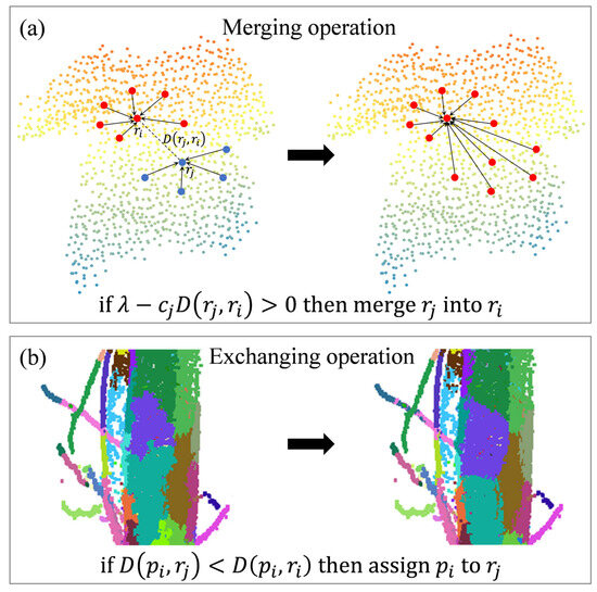 BPSS is a supervoxel segmentation method based on global energy optimization [64]. This algorithm employs an energy descent approach to transform the segmentation problem into a subset selection problem, where K representative points represent N points, and the subsets corresponding to these representative points constitute the segmented supervoxels. The algorithm comprises merge and exchange operations, as shown in Figure 4, eliminating the requirement for initializing seed points. It operates directly on the point cloud instead of working with voxels. The target function is as follows: