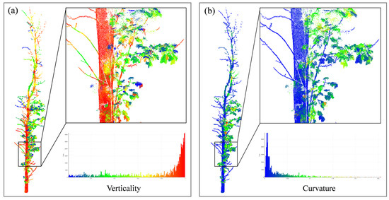 Calculation of the verticality and curvature features based on supervoxels; different colors are plotted based on the geometric feature values. The figure’s bottom right corner displays the histogram of the point cloud features, with the horizontal coordinates of the histogram representing the magnitude of the feature values. (a) Verticality; (b) curvature.