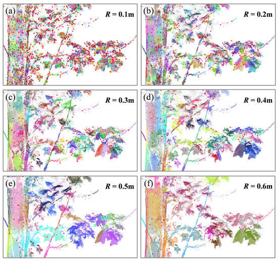 Examples of supervoxels and representative points obtained using different expected resolutions of supervoxels, with different colors representing the supervoxel and red dots representing the supervoxel representative points. (a) R = 0.1 m; (b) R = 0.2 m; (c) R = 0.3 m; (d) R = 0.4 m; (e) R = 0.5 m; (f) R = 0.6 m.