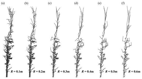 Shortest-path trees generated from representative points under different supervoxel resolutions. (a) R = 0.1 m; (b) R = 0.2 m; (c) R = 0.3 m; (d) R = 0.4 m; (e) R = 0.5 m; (f) R = 0.6 m.