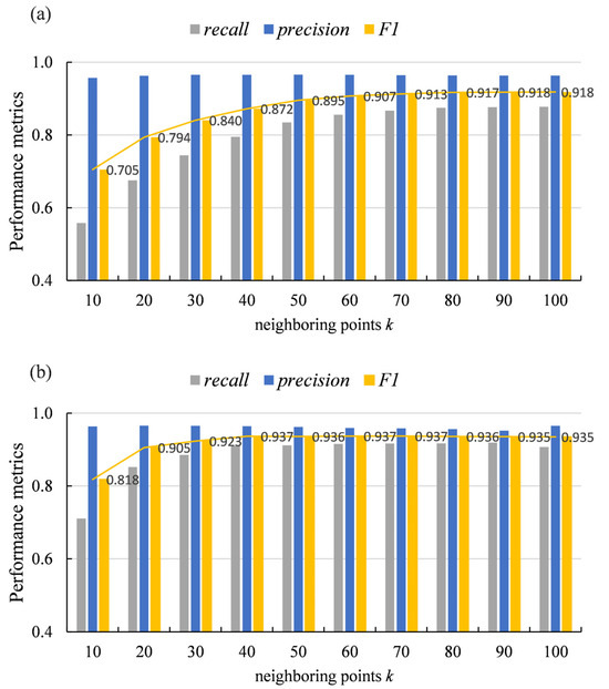 The selection of k, the number of neighboring points for optimized detection during path frequency monitoring, is related to the size of supervoxels. As shown in Figure 7b, trunk points are divided into small clusters, with each corresponding to a supervoxel representative point that serves as a graph node. Since not all trunk nodes are detected by high visit counts during path frequency monitoring, node expansion is applied to identify wood seed points to enhance detection. This process relies on differences in curvature and verticality to successfully detect wood nodes on the same branch. A small k may miss some nodes within the same branch, while a large k can reduce algorithmic efficiency. Therefore, finding an appropriate k-value is crucial. Figure 10 presents the wood point detection results (recall, precision, and F1-scores of wood nodes) on Tree 4 using varying k-values (10, 20, 30, …, 100). To thoroughly analyze the sensitivity of k to wood point detection, the DBSCAN optimization process was intentionally disabled in the experiments. As shown, when the supervoxel resolution was fixed at 0.2 m, stable results were achieved for k ≥ 40 (F1-scores ranging from 0.935 to 0.937), whereas a resolution of 0.1 m required k ≥ 70 for stability (F1-scores: 0.913–0.918). This demonstrates that the optimal k must be adaptively determined based on R. Additionally, the precision of wood point detection remained highly stable (indicating a consistently high proportion of true wood points among the detected points), validating the algorithm’s effectiveness. Notably, the recall increased with larger k until saturation, implying that smaller k-values may omit valid wood points and reduce algorithmic efficiency. In this study, k was set to 40 based on the average breast-height diameter of the experimental tree samples and the size of the generated supervoxels, which was found to be optimal through experimentation.