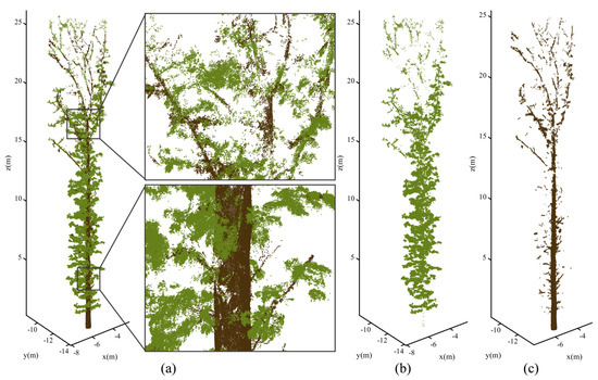 - Shcherbcheva, A.; Campos, M.B.; Liang, X.; Puttonen, E.; Wang, Y. Unsupervised statistical approach for tree-level separation of foliage and non-leaf components from point clouds. Int. Arch. Photogramm. Remote Sens. Spat. Inf. Sci. 2023, XLVIII-1/W2-2023, 1787–1794. [Google Scholar] [CrossRef]