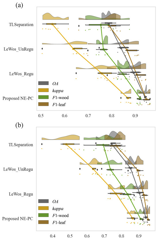 To quantitatively evaluate the performance of our method for wood–leaf separation, this study uses CloudCompare software (version 2.12.4; Girardeau-Montaut, 2023, Blacksburg, VA, USA) to manually classify leaf and branch points as the ground truth. We employed three metrics: overall accuracy (OA), F1-score (F1), and kappa coefficient (kappa), to assess the wood–leaf separation results [70]. Additionally, we calculated Type I (T1) and Type II (T2) errors to further analyze classification inaccuracies [29,44].