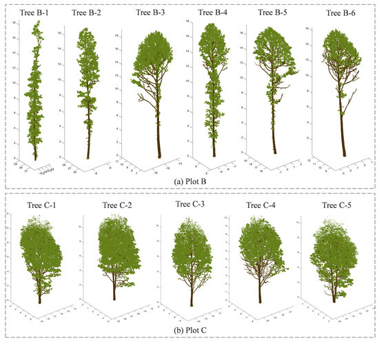 The original data obtained from the sample plot were subjected to denoising, ground point filtering, and height normalization. Ground points were obtained using an open-source cloth simulation filtering algorithm [60]. Normalization processing was carried out to eliminate the influence of terrain on the segmentation results of individual trees. The point cloud was processed using a comparative shortest-path algorithm (CSP) [61] combined with visual interpretation to obtain individual tree point clouds after height normalization. A total of 12 single-tree point cloud data were obtained for testing leaf and wood separation. This study categorized 12 single trees into linear and complex branch types. Detailed data can be found in Table 1, and the visualization of all single-tree point clouds is presented in Appendix A.