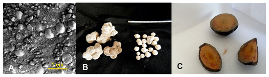 Examples of spherules: (A). Martian spherules taken with a microscopic camera, with visible spherules on the surface in sol 319. (B). Utah spherules from the Dakota Formation (Lower Cretaceous), with leached iron oxides. Visible spherules fused due to mineralization and single ones. Spherule diameter is about 1 cm. (C). Moqui marbles spherules from the Navajo Formation (Upper Jurassic) covered with iron oxides. Spherule diameter is about 4–5 cm. Photos (B,C) taken by Natalia Zalewska.