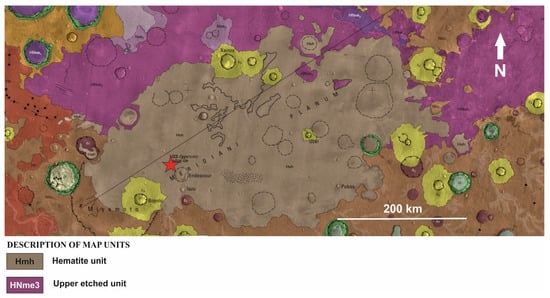- Hynek, B.M.; Di Achille, G. Geologic Map of Meridiani Planum, Mars (Ver. 1.1, April 2017); Scientific Investigations Map 3356; U.S. Geological Survey: Reston, VA, USA, 2017. [Google Scholar] [CrossRef]