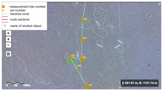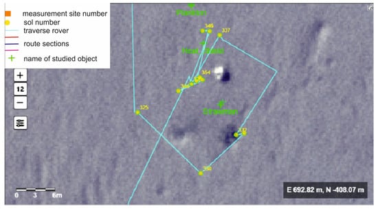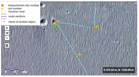 We often also used photos from some cameras taken in the same direction (Figure 6), which allowed us to determine the general characteristics of the terrain. In some places along the rover’s route, tests were also carried out with other instruments (such as the APXS and the Mossbauer spectrometer). Moreover, there are also results from the Mars orbiter available (TES). The orbital TES data have a much lower resolution, but allow for the determination of large-scale changes (e.g., gradients).