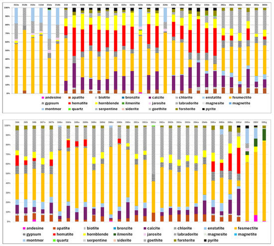 The composition of the mineralogy of this sector is similar to that of the previous sector but there is a radical reduction in the amount of hematite (below ~3%, on average). However, the contents of fe–smectite (~41%) and labradorite (up to 23%) increase. Enstatite appears in significant amounts (6%).