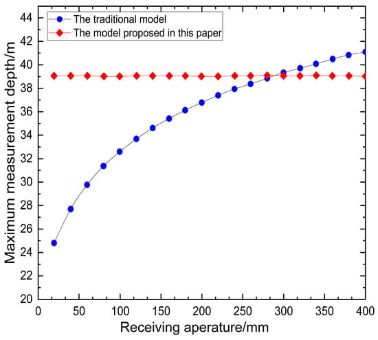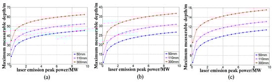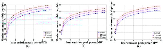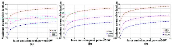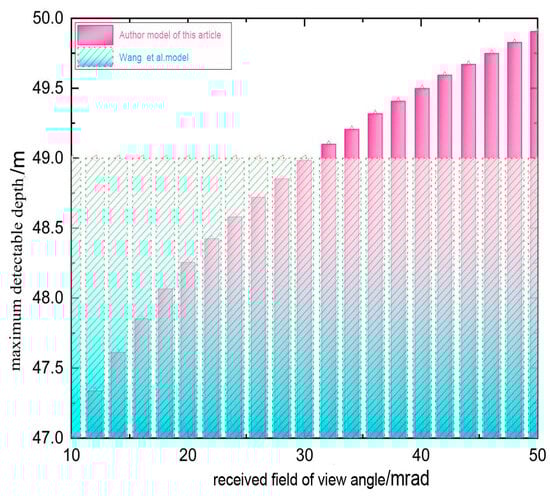 - With the same other parameters, when the receiving FOV changes from 10 mrad to 50 mrad, the maximum water depth measurable from the model established in this paper reaches 0.86 m difference in comparison with the results from the model established by Wang et al. (2003) [18]. The maximum water depth measurable from the model established in this paper reaches 1.28 m, in comparison with the results from the model established by Ding et al. (2018) [22,23]. This fact demonstrates that the model constructed in this paper is correct.