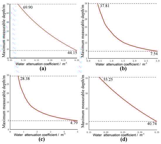 - If the parameters, including the ALB sensor, airborne platform flight parameters, transmission path parameters, transmission environment parameters and other parameters, are the same, the predicted maximum water depths are 49 m by Wang et al. (2003) [18] and 49.25 m by the model developed in this paper. This implies that their difference in maximum water depths reaches 0.25 m.