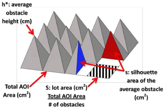 where h is the “average vertical extent”, or “effective obstacle height”, measured in cm, s is the “silhouette area of the average obstacle”, measured in , and S is the “specific area”, or “lot area” measured in [6]. Figure 1 shows these physical parameters for an idealized case of simple pyramids.