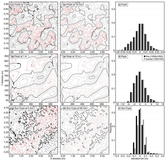 The three gridded datasets used in the computation as 1000 by 1000 pixels (a,d,g) and coarsened by a factor of 10 (b,e,h), plus the histograms of the distribution of elevation for each surface (c,f,i) for (a–c) fresh snow in Fort Collins (lines in 0.005 m intervals), (d–f) peak accumulation at Niwot Saddle (lines in 2 m intervals), and (g–i) ablation sun cups in the Poudre Headwaters (lines in 0.05 m intervals). The surfaces have been detrended to remove any slope-based bias [43]. As such, black lines/areas are above the datum of zero while red lines/areas are below the datum of zero.
