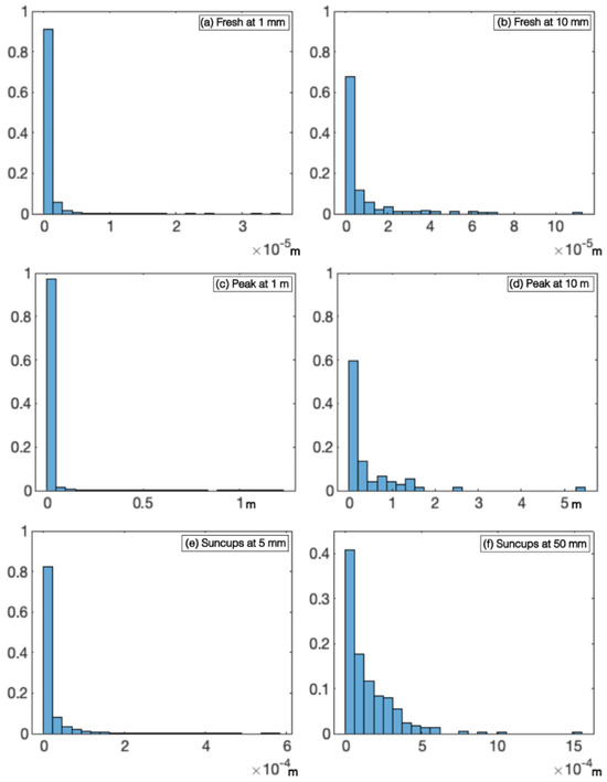 Histogram of values for the peak accumulation on fresh snow in Fort collins at (a) 0.001 m and (b) 0.01 m resolutions, the Niwot Saddle (c) at 1 m and (d) 10 m resolutions, and the ablation sun cups at the Poudre Headwaters at (e) 0.005 m and (f) 0.05 m resolutions for an eastward wind.
