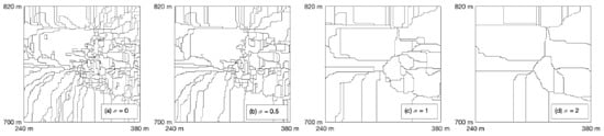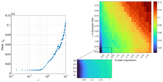 As discussed in Section 2.3, two optional parameters, and % of maximum height, may be chosen to smoothen the surface before calculating . For the values reported in Table 3 and Figure 3 and Figure 4, no smoothing was implemented (both smoothing parameters were set to 0). To illustrate how depends on these parameters, we calculated for ranges parameter values for the Niwot 1 m dataset. Figure 5 shows the results. For small values of , is insensitive to the choice of , as seen in the left panel of Figure 5. For larger values of , the surface is smoothed to the extent that essential roughness features are lost. Figure 6 illustrates how the watersheds associated with peaks of the surface decrease as increases. However, does depend more sensitively to the % parameter for small values of , as seen in the right panel of Figure 5.
