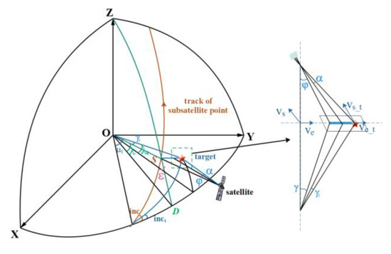 The star–Earth relationship—as a satellite moves from a low to a high-latitude region—is shown in Figure 2. When the satellite in a sun-synchronous orbit captures images on the polar target side pendulum, with the star under the point for the S point and side-pendulum angle , the camera view axis points to the target point S, and the target point along the longitude is plumb to the equatorial plane intersecting it at point D. Angle is the latitude of the view axis, and angle is the view axis corresponding to the geocentric angle. The target point outside the view axis corresponds to a different field-of-view angle α. The geocentric angle corresponds to the target point and the visual axis is .