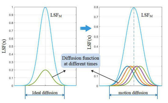 At the integration time, the diffusion function was derived from the superposition of the diffusion function at different moments. When there was an image shift, the width of the diffuse spot increased, the peak energy decreased, and the image became blurred. In addition, if the image shift is irregular, the position of the diffuse spot also changes, leading to a geometric distortion of the image, as shown in Figure 3. Therefore, to accurately analyse the on-orbit imaging quality of a TDI-CMOS imaging system in the digital domain, it is necessary to construct a dynamic-imaging shift–transfer function model.