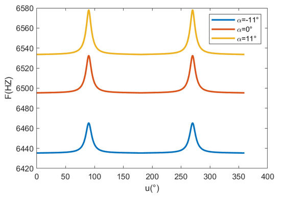 As shown in Figure 5, as Earth’s rotational velocity changes, little difference is observed between the target ground speeds of different fields of view at low latitudes, but an obvious difference exists between the target ground speeds of different fields of view at high latitudes. As shown in Figure 6, the travelling frequency differs for different fields of view: the travelling frequency changes significantly in the stage of entering the high-latitude region and reaches the maximum value when the amplitude angle is 90°. At this point, the image-shift speed of the various positions of the field of view is the smallest.