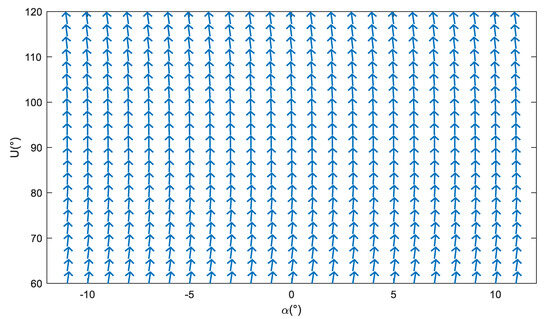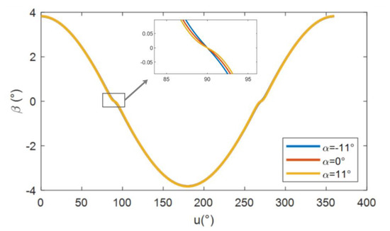 As shown in Figure 7, when the side pendulum is photographed at 45°, the rate of change in the rotation vectors in different fields of view accelerates as the dimension increases. Figure 8 shows the variation curve of the bias flow angle with angle β between the substellar point and an ascending node at a side-pendulum angle of 45°.