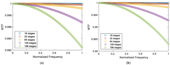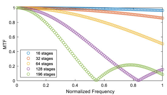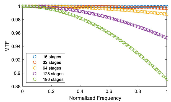 For the sub-satellite-point imaging scene, if the camera field-of-view angle is ±30° and the yaw-angle difference is 0.1°, in order to ensure that the MTF decline does not exceed 5%, as shown in Figure 11, the integration level should be limited to below 128 levels; then, the system performance can meet the task requirements.
