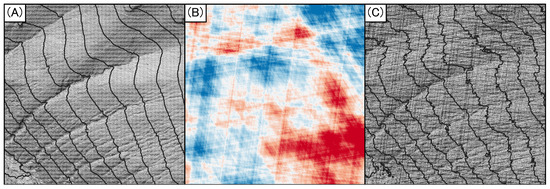 A preliminary assessment of a spatially distributed array of Kalman filters was conducted on a small 500 × 500 cell DEM with a spatial resolution of 0.15 m, collected with UAV-LiDAR near Atsuma, Hokkaido, Japan (42.780°N, 142.020°E). A field of spatially auto-correlated noise was generated using a turning bands simulation [66] with five iterations and an auto-correlation range of 75 m. All noise fields were centered and scaled such that the mean was zero and the standard deviation was 0.1 m. This experiment simulates a static surface where the initial uncorrupted DEM was assumed to be true, and 50 epochs of corrupted observations were analyzed using 5 × 5 cell observation windows. The ARK-∅A filter was compared to an OLS estimator to eliminate the choice of initial process noise due, which does not apply a static surface. All ARK-∅A filters were initialized with , and the state was initialized with an OLS estimate. An example of a single epoch of this process is visualized in Figure 2.