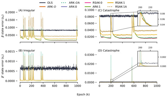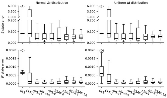The average error values for all cases, and excluding the individual parameter space search results, were aggregated, and the error distributions are summarized in Figure 3. The rows record the error for the and coefficients and the columns record the temporal distributions. The increased measurement noise due to DEM subtraction is evident when comparing the OLS model error distributions between the and coefficients. This is particularly apparent for the uniform distribution (Figure 3B,D). The filters with null or zero-order process noise models tended to perform better than the first-order filters. Interestingly, the ARK-∅ and ARK-∅A filters achieved low error across all simulations by adaptation alone, independently of any process noise model. While the error distributions for the coefficients were relatively similar for OLS and Kalman filters, all Kalman filters had much lower coefficient error.