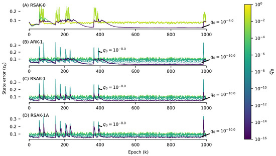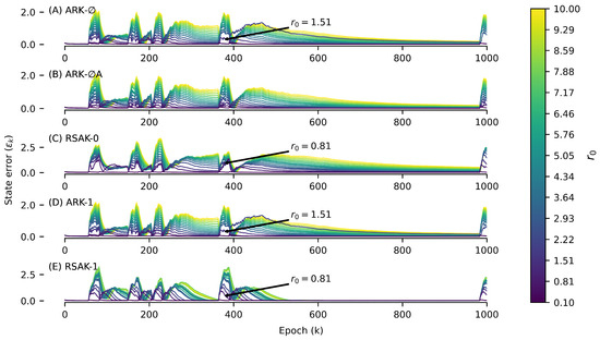 The simulation results were summarized as the average and maximum state error over all epochs using the normal time distributions for the static, periodic, irregular, and catastrophic cases in Table 1, Table 2, Table 3 and Table 4, respectively. These tables provide a coarse impression of the impact of and choice combinations on filter performance. In general, all Kalman filters achieved lower average error than OLS. However, maximum error for all adaptive Kalman filters was commonly near or slightly higher than OLS. Otherwise, relative to the OLS estimator, the adaptive Kalman filters reduced average error by approximately 50% for most simulations (Table 1, Table 2, Table 3 and Table 4), up to approximately 80% (Table 1). All filters performed particularly poorly when noise was greatly overestimated (i.e., ), and the performance of CKF at very low process noise (i.e., ) was extremely poor. The RSAK-0 filter also performed particularly poorly for the periodic case (Table 2), and both RSAK-1 and RSAK-1A had notably large maximum errors for the irregular and catastrophe cases (Table 3 and Table 4). The choice of had minimal impact on average and maximum error for all adaptive Kalman filters when it was accurately estimated or underestimated, and approached the OLS estimator performance when it was overestimated. Typical maximum error for the adaptive Kalman filters was 30% or 40% greater than the OLS maximum error when and were roughly equivalent when (Table 1, Table 2, Table 3 and Table 4). Note that ARK-∅A performance data are not available for the catastrophe case with the lowest noise parameter settings due to fatal matrix inversion errors.