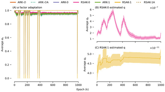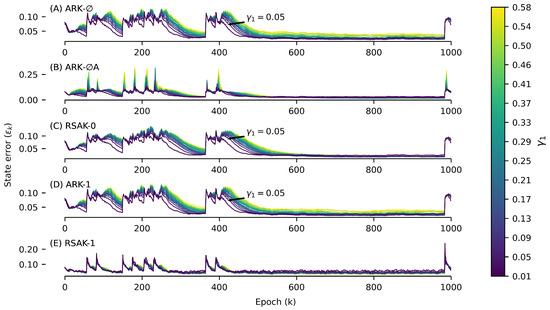 All Kalman filters were initialized with first-order continuous white noise, which models the effect of zero-mean continuous variability in kinematic components [65] and is defined by Equation (48). Both ARK and RSAK were initialized with process uncertainty described by multiple continuous white noise model orders in addition to the first-order model due to the high sensitivity and variability of . Zero-order continuous white noise models are less sensitive to and only affect the surface model coefficients, and are defined by Equation (47). Finally, Equation (46) was used to examine the effect of only adaptation by ignoring process uncertainty (i.e., a null matrix). The noise model order is labelled as a suffix to each estimator. Additionally, the suffix ‘A’ was added to denote estimators configured with an asymptotic function that use Equation (15).