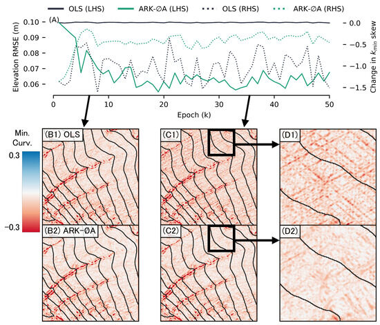 The estimated elevation (i.e., the intercept ) for each of the 250,000 filters was recorded at each epoch and compared to the true DEM. Additionally, the spatial distributions of minimal curvature were generated for a qualitative assessment. Minimal curvature () is the curvature of a principal section with the lowest value of curvature [25,26] and can be calculated from the spatial partial derivatives defined in Equation (32) using Equation (55). Minimal curvature values tend to be large when the local geometry resembles a channel, which skews negatively when linear errors are abundant [27].