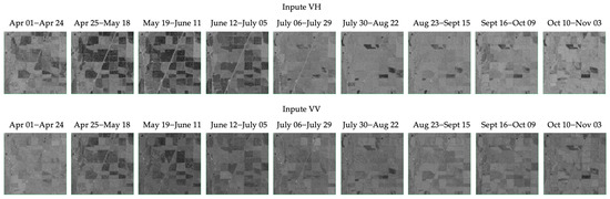 Sentinel-1 SAR data are among the most widely used sources for rice mapping, especially in cloud-prone subtropical regions, as it can effectively mitigate the impact of missing optical data. Sentinel-1 was the first satellite launched under the European Space Agency’s (ESA) Copernicus Program [31]. It consists of two polar-orbiting satellites, Sentinel-1A and Sentinel-1B, which share the same orbit [32]. In this study, dual-polarization time-series data in interferometric wide-swath (IW) mode, including vertical transmit, vertical receive (VV) and vertical transmit, and horizontal receive (VH) polarizations, were obtained. The time series, covering the primary rice-growing season, extends from April to November 2019. The collected dual-polarization SAR images were preprocessed via the Google Earth Engine (GEE) platform, including calibration and terrain correction. To reduce speckle noise and emphasize phenological information, a 24-day average composite time series of the dual-polarized backscatter coefficients for the rice-growing season was generated, as shown in Figure 2. This strategy is suitable for SAR data, where speckle is inherent. The rice growth cycle includes about nine phenological stages, each lasting 20–30 days. A longer compositing interval may lose important phenological transitions, while a shorter one may cause redundancy. Thus, a 24-day window offers a balance between noise suppression and phenological detail retention. This design also aligns with Yang et al. [26], ensuring consistency and comparability. Two sets of nine-band time-series composites were obtained for VV and VH polarizations, totaling eighteen bands. Each band represents a 24-day average composite, as detailed in Table 1. The time-series images were then resampled to a resolution of 30 m to ensure consistency with the CDL data.