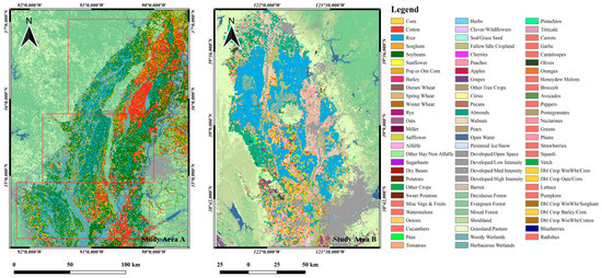 2019 Cropland Data Layer (CDL) products in the same colors as the CDL website shows for Study Area A and Study Area B. https://nassgeodata.gmu.edu/CropScape/ (accessed on 20 April 2025).