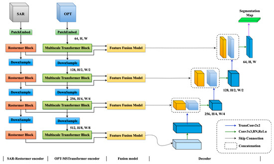 The overall network structure of RDTFNet is illustrated in Figure 4. As a hybrid of U-Net and the transformer, RDTFNet retains the excellent hierarchical structure of U-Net, specifically using skip connections to effectively integrate features between the encoder and decoder. To fully leverage the diverse and complementary characteristics of multisource RS data, we replace the conventional encoder with a dual-branch structure that is designed to extract both shallow and deep spatiotemporal–spectral (STS) features of rice from optical and time-series SAR images separately.