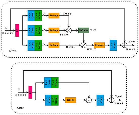 Specifically, the feature map first enters MDTA, where a 1 × 1 pointwise convolution aggregates pixelwise cross-channel context to extract temporal features, whereas a 3 × 3 depth-wise convolution encodes channel-wise spatial context to capture spatial features, generating a query (Q), key (K), and value (V). The projections of the query and key are then reshaped, and feature covariance is calculated to produce a global attention map. The global attention map generated by MDTA then enters the GDFN, a module that introduces gating mechanisms instead of conventional feed-forward networks to regulate information flow across channel levels. Like MDTA, the GDFN includes depth-wise convolution, which is beneficial for learning local image information. Therefore, for a given input feature X∈RT×H×W, the process definitions of MDTA and the GDFN are shown in (4)–(5) and (7)–(8):