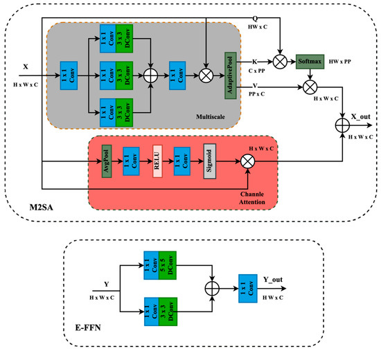 Specifically, for the encoder output feature X∈RC×H×W, C denotes the channel dimension, and H and W denote the image dimensions. First, feature X is reduced by a factor of 4 in the channel dimension via three parallel 1 × 1 convolutions. Then, four 3 × 3 depth-wise convolutions with different dilation rates capture multiscale information, with weights shared across branches. As the downsampling scale decreases, the dilation rates decrease layer by layer, with dilation rates Di set as (7,9,11), (5,7,9), (3,5,7), and (1,3,5) for each stage’s M2SA module across the four downsampling stages. Next, the original channel dimension is restored through three parallel 1 × 1 pointwise convolutions. Finally, the multiscale features from the four branches are summed to produce a multiscale global attention map. This attention map is then fed into the E-FFN. To capture local information from 2D images, the E-FFN module replaces the fully connected (FC) layers in the FFN with 1 × 1 convolutions and incorporates two parallel depth-wise separable convolutions (3 × 3 and 5 × 5), thereby retaining the CNN’s local extraction capabilities. The process definitions of M2SA are shown in (9)–(13):