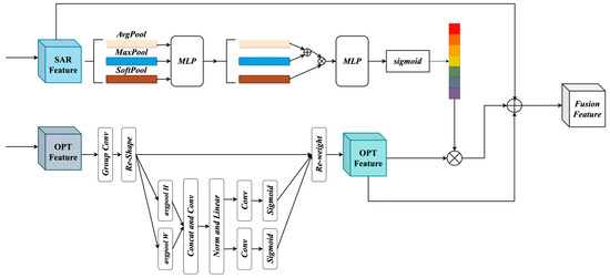 Optical imagery typically contains richer spatial features than SAR imagery does, but optical imagery is susceptible to clouds and extreme rainfall. In contrast, SAR can penetrate clouds and resist most weather disturbances, providing more robust temporal resolution. However, SAR imagery is easily affected by Doppler effects and speckle noise. Therefore, data fusion techniques should be used to combine the strengths of both modalities to improve the accuracy of rice extraction. Inspired by feature-level fusion, we design the feature fusion module (FFM), as illustrated in Figure 7.