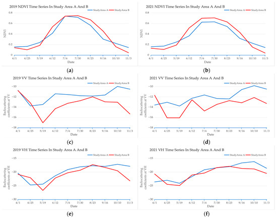 Time-series curves of the rice NDVI and backscattering coefficients at VV and VH for different regions and years; (a) 2019 NDVI time-series curves for rice in Study Area A and Study Area B; (b) 2021 NDVI time-series curves for rice in Study Area A and Study Area B; (c) 2019 time-series curve of backscatter coefficients at VV polarization for rice in Study Area A and Study Area B; (d) 2021 time-series curve of backscatter coefficients at VV polarization for rice in Study Area A and Study Area B; (e) the 2019 time-series curve of backscatter coefficients at VH polarization for rice in Study Area A and Study Area B; (f) 2021 time-series curve of backscatter coefficients at VH polarization for rice in Study Area A and Study Area B.