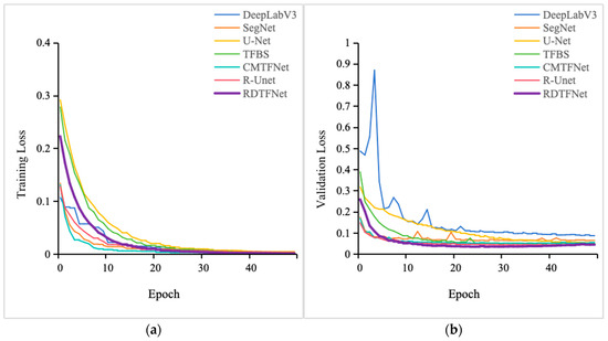 (a) Training loss values of RDTFNet and the six conventional models. (b) Validation loss values of RDTFNet and the six conventional models.