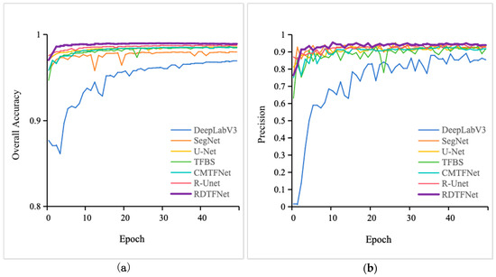 RDTFNet was compared with six classical models, including R-Unet, CMTFNet, TFBS, U-Net, SegNet and DeepLabV3, to evaluate its effectiveness in rice extraction. The 2019 dataset from Study Area A was used for training and validation, while the 2019 test set (Test Area A) served as the test dataset. In Study Area A, the 2019 dataset was used to train and validate seven models. The training loss was recorded, along with the overall accuracy (OA), intersection over union (IoU), precision, recall, and F1-score on the validation set.