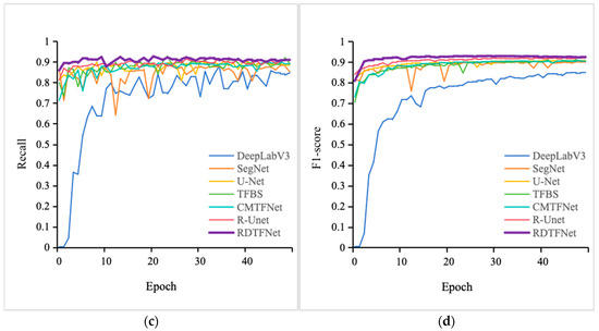 OA, precision, recall, and F1-score of RDTFNet and the six conventional models for the validation samples. (a) Overall accuracy, (b) precision, (c) recall, and (d) F1-score.