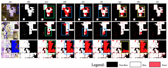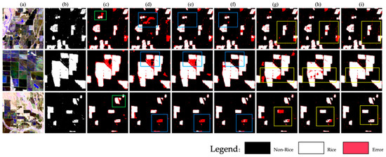 Comparison of rice extraction results from different models in the 2019 Test Area A: (a) optical index image (RGB corresponds to the NDVI, EVI, and LSWI); (b) ground truth map; and (c–i) rice prediction results from DeepLabV3, SegNet, U-Net, CMTFNet, TFBS, R-Unet and RDTFNet (ours).