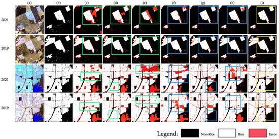 Table 6 presents the performance of RDTFNet and six classical models on the 2021 test set from Study Area B. Compared with the 2019 test results, all models exhibited varying degrees of performance degradation on the 2021 dataset, indicating that spatiotemporal variation poses significant challenges to rice extraction. DeepLabV3 showed a 10.08% decrease in IoU and a 7.02% drop in F1-score, highlighting its limited ability to detect rice field boundaries and small patches and its susceptibility to temporal variation. SegNet, U-Net, and CMTFNet experienced IoU reductions of 5.57%, 4.63%, and 7.68%, respectively. Their relatively low generalization capability is attributed to their reliance solely on spatial features, making them less adaptable to interannual variations in rice growth conditions. TFBS and R-Unet showed IoU decreases of 5.45% and 4.50%, respectively. Although both consider temporal information, their feature extraction approaches limit their ability to capture the complex rice growth cycle, resulting in considerable misclassification. In contrast, RDTFNet exhibited only a 3.44% reduction in IoU, with comparatively minor declines in precision (3.44%) and recall (3.16%), maintaining the most stable performance among all models. These results suggest that RDTFNet is more effective in modeling the spatiotemporal characteristics of rice, mitigating feature drift caused by temporal shifts and, thus, demonstrating superior robustness and generalization in cross-temporal rice extraction tasks.