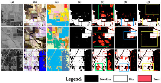 Comparison of rice extraction results using unimodal (optical), unimodal (SAR), and multimodal (optical and SAR) data: (a) VH backscatter coefficient image (June 2021 VH), (b) optical indices (with RGB representing the NDVI, EVI, and LSWI), (c,d) ground truth image, and (e–g) rice prediction results of RDTFNet using unimodal (optical), unimodal (SAR), and multimodal (optical and SAR) inputs, respectively.