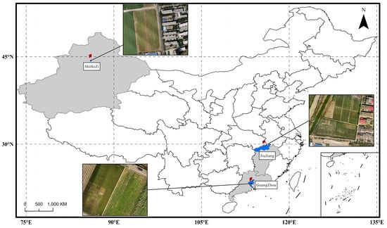 In this experiment, multispectral images of various ground features were collected from three distinct regions of China: Shihezi City in Xinjiang (44.30°N, 86.00°E), Jiujiang City in Jiangxi Province (29.71°N, 115.83°E), and Guangzhou City in Guangdong Province (23.23°N, 113.63°E), as illustrated in Figure 1. These regions, extending over 20° in latitude, encompass diverse climates, including temperate continental and subtropical monsoon, and feature a wide array of ground objects, including both vegetated and non-vegetated areas. The imagery covers an area exceeding 230 hectares.