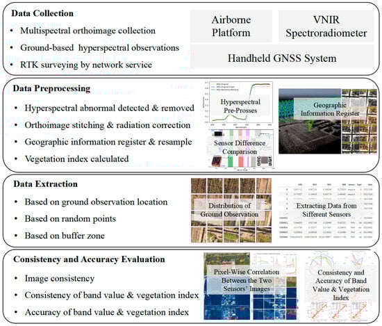 These regions were selected for their variety in vegetation types, urban and rural landscapes, and climatic conditions. The combination of agricultural areas, impervious surfaces, water bodies, and trees in these regions provides a comprehensive test environment for evaluating sensor calibration and radiometric correction methods, ensuring that the sensors are tested under diverse real-world conditions. Figure 2 depicts an overview of our study design and workflow.