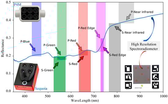 For simultaneous remote sensing image acquisition, the Parrot Sequoia® multispectral camera (Parrot, Paris, France) was affixed to a DJI Phantom 4 Multispectral (P4M) drone (DJI, Shenzhen, China) using a custom platform. While both cameras are equipped with light sensors, the Sequoia features four spectral bands, in contrast to the P4M’s five. Radiometric correction preparation for both sensors involved capturing images of correction plates (Figure 3). The wavelengths and bandwidths of the cameras are depicted in Figure 4, and the reflectance of the correction plates was measured with an ASD FieldSpec 4 Hi-Res spectroradiometer (Malvern Panalytical, Worcestershire, UK).