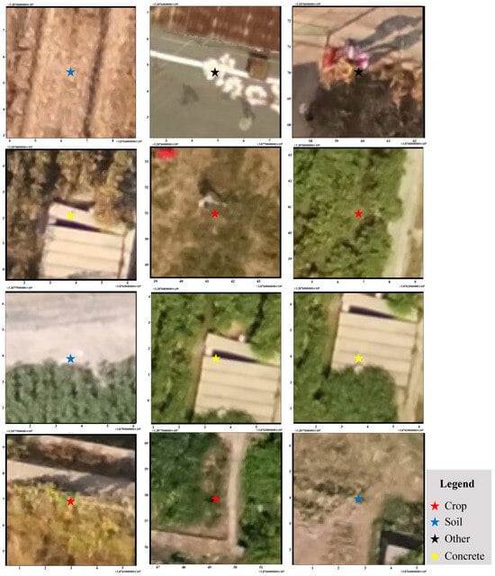 The planning and execution of the drone flights were facilitated by DJI GS Pro software (DJI, Version 2.0.17, Shenzhen, China) and conducted during noon for optimal lighting. The camera gimbal was set to a −90° angle, ensuring a 75% overlap rate between images. Each flight mission took about half an hour (Table 1). We selected ground sampling points in each experimental field to cover the diversity of ground cover types; most points were distributed in various types of vegetation. Figure 5 displays some of the typical types of sampling points. Hyperspectral reflectance data were gathered using the HandHeld2 ASD field spectrometer (Malvern Panalytical, Worcestershire, UK), with ten spectral curves obtained at each measurement point. The equipment, equipped with a 25° field-of-view foreoptic, positioned 35 cm above the ground and oriented towards the sun, covered a sampling area of 200 square centimeters. Whiteboard calibration was conducted using a Spectralon diffuse white reference panel (Malvern Panalytical, Worcestershire, UK) with a nominal reflectance of 0.999, supplied with the ASD HandHeld2 system. Calibration was performed at 15 min intervals or after changes in cloud cover, ensuring accurate correction of field-measured reflectance. In total, over ten types of ground objects and 80 sets of spectral reflectance data were gathered across the three regions. Each set of data contains 10 records, and the integration time for each record is 200 milliseconds. Each sampling point was geographically coordinated using Trimble Geo 7X (Trimble Navigation, Sunnyvale, CA, USA) in conjunction with the Qianxun Spatial Intelligence Inc. (Shanghai, China) network differential positioning service for real-time kinematic (RTK) surveying. With 5 to 10 records collected per positioning point at an accuracy of 1–2 cm, the geographic coordinates ensured consistency between ground features measured by the ASD and those captured by the UAV. These sampling points were used to validate UAV-derived reflectance values and serve as ground truth for evaluating the accuracy of vegetation indices and calibrating the sensor conversion models.