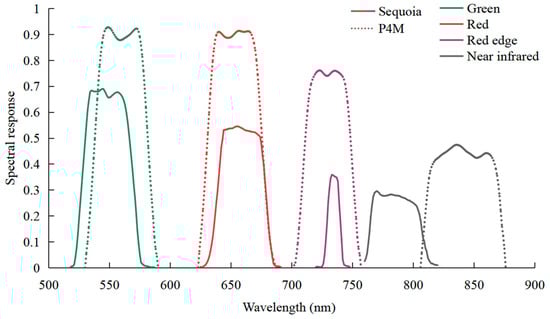 The multispectral images collected were initially processed using Pix4D mapper software (Pix4D, Version 4.4.12, Ecublens, Switzerland) for image stitching and radiometric correction. For the radiometric correction, we employed three approaches: The first method, standard correction (Stand), used the manufacturer-labeled reflectance values of the calibration plate [30]. However, over time, wear and tear on the calibration plate can lead to discrepancies between the standard and actual reflectance. The second method, ASD-based correction (ASD), involved recalibrating the plate’s reflectance using an ASD FieldSpec 4 under a tungsten halogen light source in a controlled indoor environment. The resulting reflectance spectrum was then converted into weighted average reflectance for each sensor’s spectral response (Figure 6). The relative spectral response (RSR) curves for the Sequoia and P4M multispectral sensors were obtained from the manufacturers. As the same reference panel was used in all field campaigns and remained in good condition, the recalibrated reflectance was applied across all experimental locations. The third method, uncorrected (DN), used the original digital number (DN) values without any radiometric correction. This process yielded two sets of orthophotos with corrected reflectance and one set with uncorrected DN values. Figure 7 illustrates the standard reflectance of the calibration plate and the weighted average reflectance for each sensor’s wavelength bands. Reflectance conversion follows the general Formula (1),