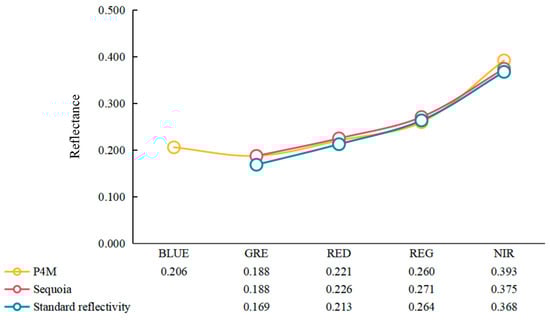 The standard reflectance of the radiation correction plate and the average reflectance for the sensor bands. GRE, RED, REG, and NIR represent the four bands, green, red, red edge, and near-infrared, respectively.