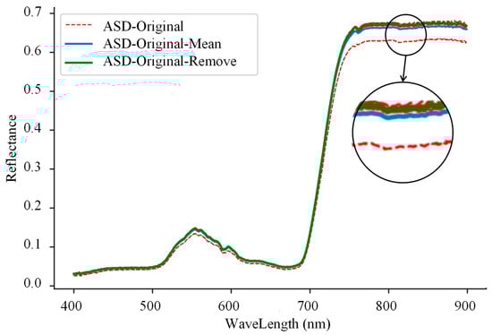 For each hyperspectral data sample, the average value was calculated from the spectral curves post-outlier removal. The average reflectance within the band ranges corresponding to the two sensors’ bands was then considered the measured spectral reflectance for those bands.