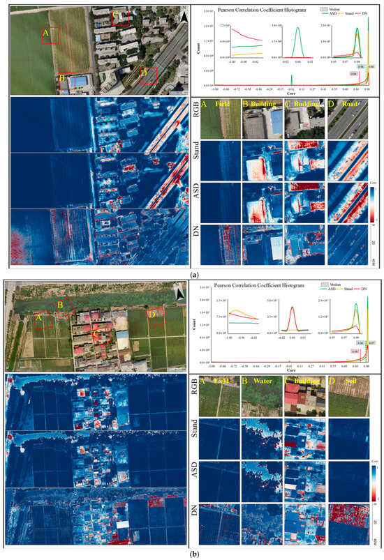 The correlation analysis of the four bands in this study revealed varying degrees of correlation between the two sensors, contingent on the type of ground objects and the radiometric correction methods employed. Figure 9 presents the Pearson correlation between corresponding reflectance images from the P4M and Sequoia sensors, evaluated under three different radiometric calibration conditions (standard reflectance, re-measured/ASD reflectance, and uncorrected DN). The left section of the figure displays RGB images and the pseudo-color maps of Pearson coefficients under different radiometric correction methods. These colors, determined by the corresponding Pearson coefficients, are used to spatially assess the coefficient distribution. The upper right section shows histograms of the pseudo-color images, aiding in evaluating the Pearson coefficient distributions between sensors under various correction methods, with insets focusing on specific values at −1, 0, and 1. The lower right section highlights representative details of these enlargements, revealing distinct correlations in reflectance images derived from different correction methods. Notably, most pixel correlations post-correction were above 0.97 (median > 0.97), while correlations without correction predominantly exceeded 0.75 (median between 0.75 and 0.9).