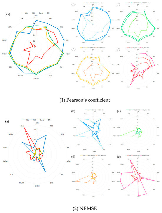 Consistency test of each band value of different sensors and vegetation indices. In order to facilitate the interpretability of the image, data with an NRMSE value exceeding 3 were replaced with 3. The original data are presented in Appendix A. (a) Comparison of all data under different correction methods; (b) Comparison of all data grouped by vegetated (NDVI > 0.2) and non-vegetated (NDVI ≤ 0.2) areas; (c–e) Comparisons under the three correction methods—ASD-based correction (c), standard panel correction (d), and uncorrected DN values (e)—each grouped by vegetated and non-vegetated areas.